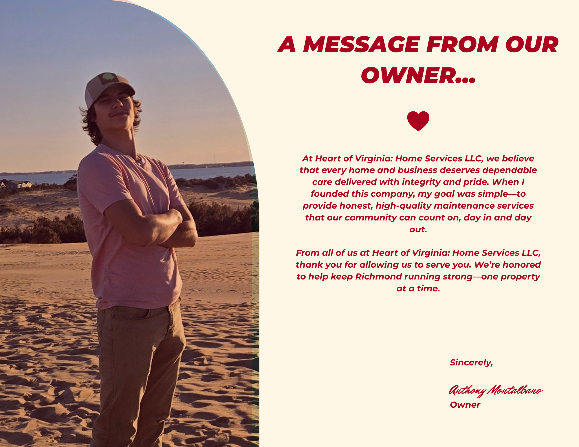 At Heart of Virginia: Home Services LLC, we provide professional residential and commercial maintenance, cleaning, repairs, and exterior services across Central Virginia.